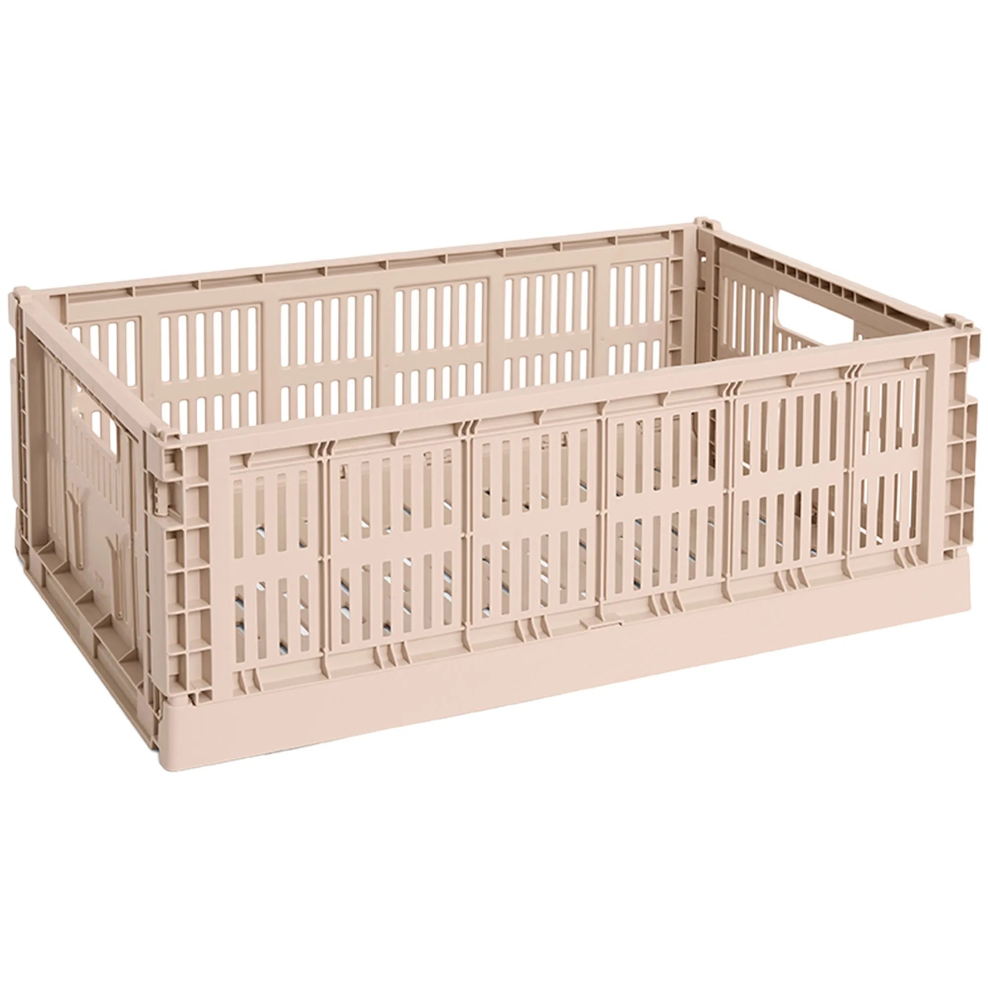 Den pudderfarvede HAY Colour Crate i størrelsen large er en funktionel opbevaringsløsning, der hjælper med at skabe orden i alt fra tøj og legetøj til kontorartikler, køkkenting og rengøringsmidler. Opbevaringskassen måler 34,5 x 53 x 18,5 cm og har et pe