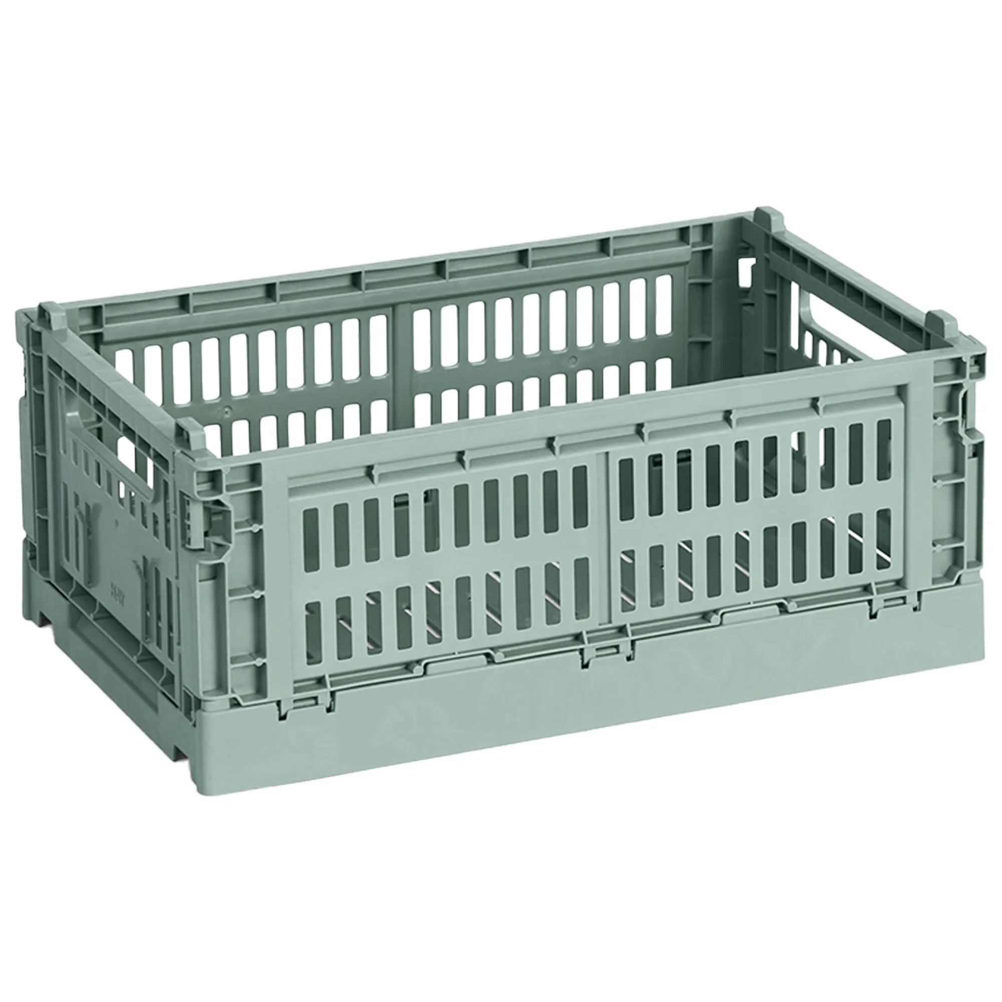 Gør organiseringen både praktisk og smuk med den salviegrønne HAY Colour Crate i størrelse small (17 x 26,5 x 10,5 cm) – en alsidig og dekorativ opbevagingskasse til med et karakteristisk, luftigt design, der er enkle at folde ud, men også klappen samme