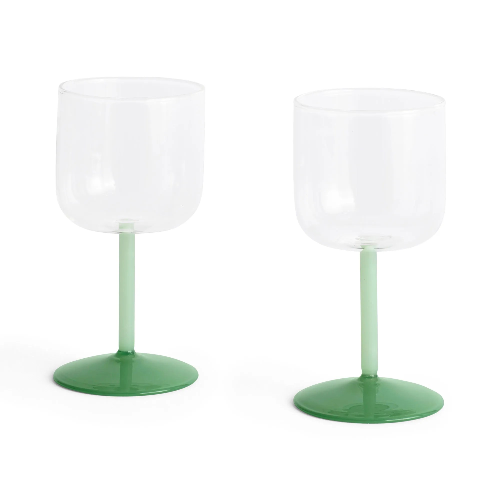 Tilføj farve og personlighed til bordet med HAY Tint vinglas i farvekombinationen clear/jade light green/jade dark green. De elegante glas er lavet i farvet og transparent borosilikatglas, som både er let og holdbart – ideelt til både hverdag og fest.Sæ