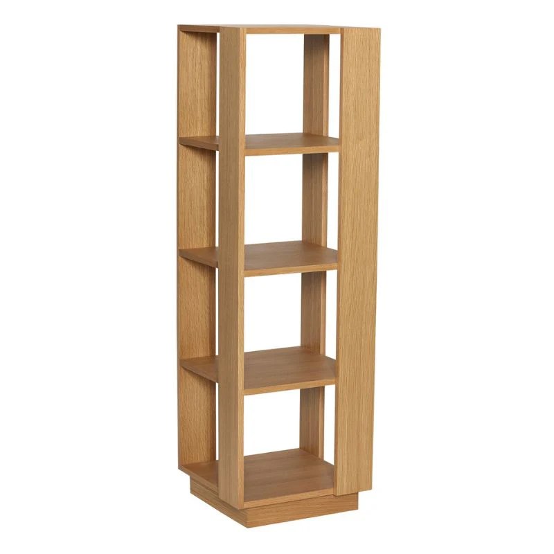 Høj skulpturel reol med 3 hylder Flot reol med målene 45 cm x 45 cm x 140 cm. Reolen er fremstillet af egetræsfiner og MDF, og der er mange naturlige detaljer og årringe i træet, hvilket gør hver eneste reol helt unik. Reolen er udformet i et skulpturelt