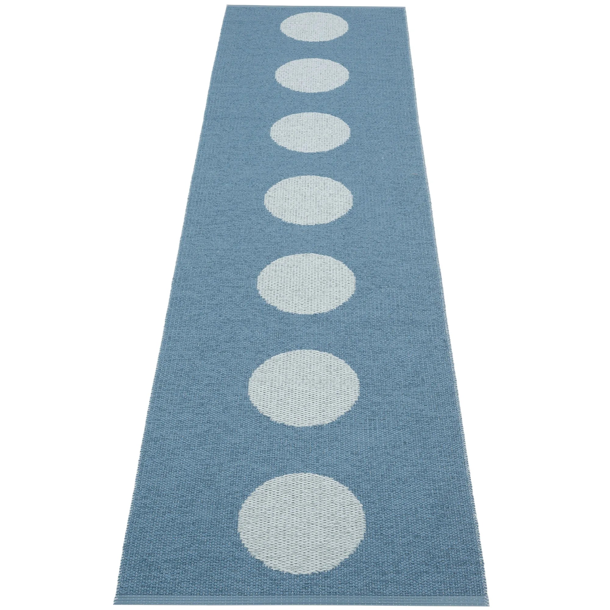 Du tilfører rummet en rolig, men alligevel legende stemning med Vera Pop-løberen i farverne River og Blue Fog fra Pappelina. De bløde blå nuancer og de hævede cirkler skaber en sanselig tekstur, der gør løberen både visuelt interessant og behagelig at gå
