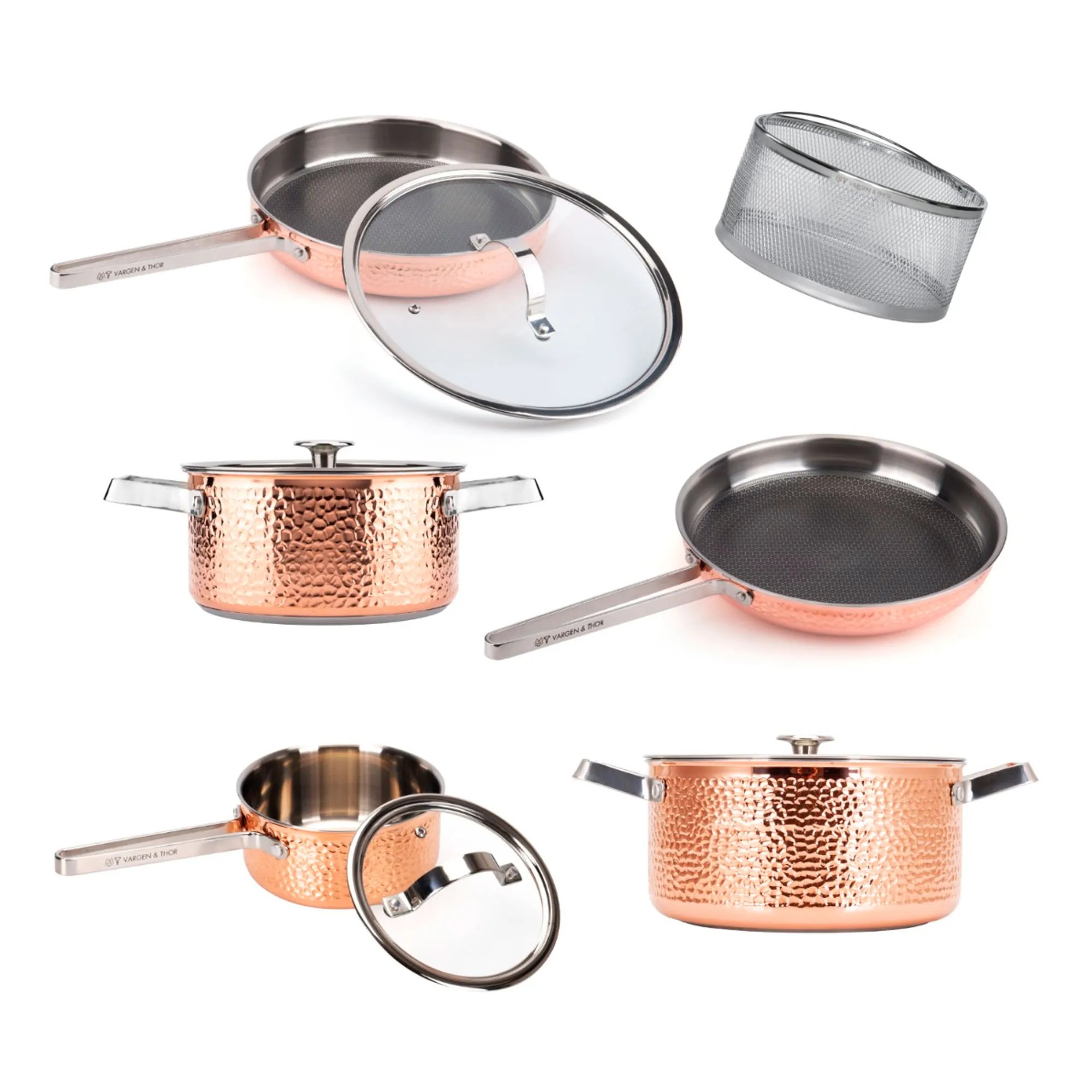 Mjölner XL fra Vargen & Thor er et eksklusivt gryde- og pandesæt, der forener traditionelt håndværk med moderne funktionalitet. Alle dele er fremstillet i ægte, poleret kobber med rustfri inderside og detaljer i messing, hvilket giver enestående varme