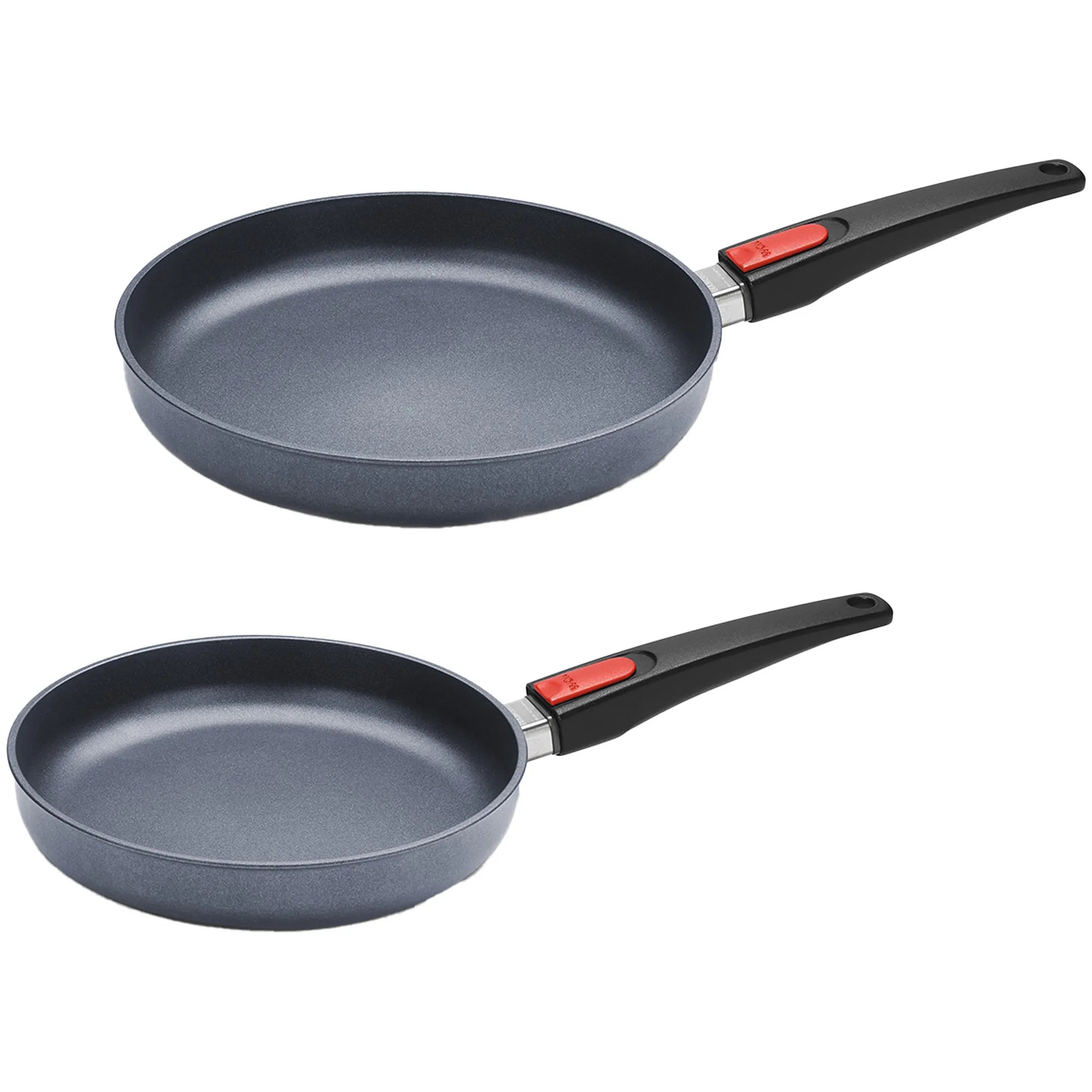 Stegepandesættet i Woll Diamond Lite-serien indeholder to pålidelige pander i størrelserne henholdsvis 24 og 28 centimeter i diameter, og de er velegnet til alt fra omeletter og grøntsager til større måltider og tilberedning af både kød og fisk.Begge pand